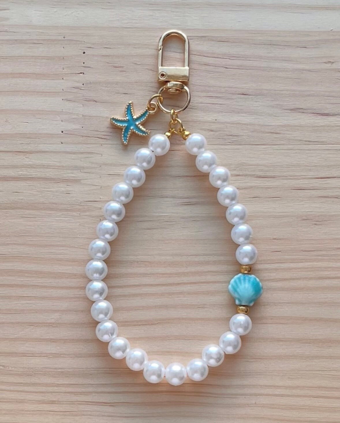 Handgemaakte trendy telefoonkoord met witte Glasparels 8mm, gouden Miyuki kralen 4 mm en een Turquoise keramiek schelp. Super leuk gecombineerd met een bijpassende turquoise zeester bedel.
