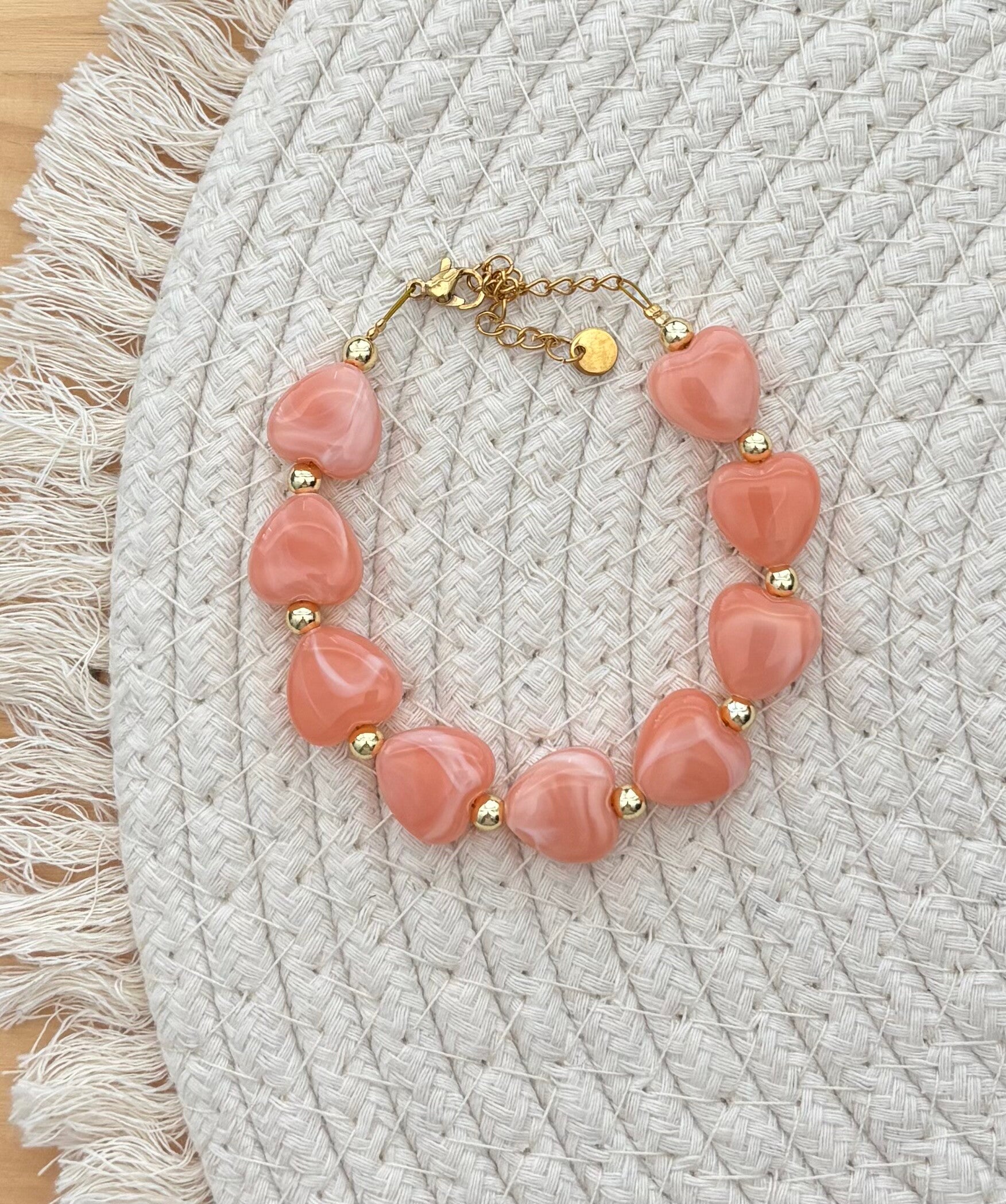 Prachtige armband met synth.Hematiet goldplated kralen of silverplated Hematiet kralen (4mm) gecombineerd met oranje hartjes (14mm).